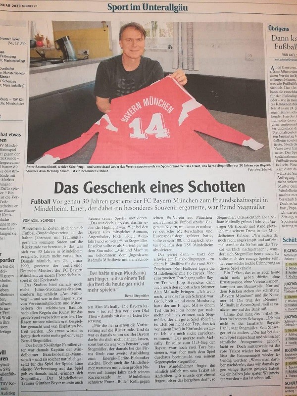 Der Vorsitzende des Vereins schickte mir sämtliche Zeitungsberichte die er von damals hatte. In einer Notiz am Rand des Berichts steht, dass sich die Mindelheimer Spieler nach der Begegnung an Uli Hoeneß wandten und nach den Trikots Ihrer Gegenspieler fragten. Dieser lehnte mit Blick auf die Kosten für einen Trikotsatz ab. Alan McInally muss von der starken Leistung seines Gegenspielers Bernhard "Bazi" Stegmüller begeistert gewesen sein weshalb er auf Hoeneß zuging und schließlich doch die Freigabe erhielt, sein Trikot herzuschenken.